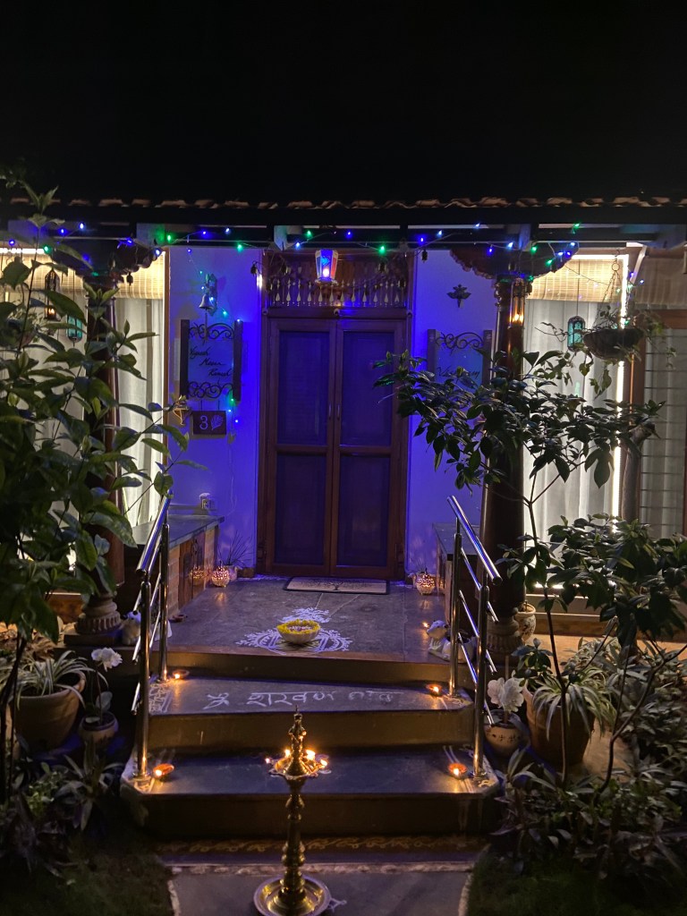 Either way it is celebrated with the bursting of crackers , creative expression of design forms on the entrance of homes called rangoli and lighting of lamps to decorate homes. In the south of India it is celebrated at dawn and in the north it is celebrated at dusk. Either way the decorative lamps and the bursting of fire crackers transforms the environment from darkness to light.